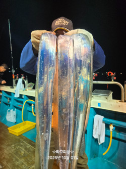 10월1일(수.2물) 갈치조황입니다.예민하고 까칠한 갈치들 만나고 왔습니다.초반부터 풀치가 ... 좀 설치네요.물론 3지반 4지도 올라오고요. 올라오는 속도가 좀 붙나싶더니파박 조용 파박 조용사이즈는 아주 베리 나이스입니다. 더 붙어야될 속도가 느려지면서다른 곳 상황도 알아봤지만 특별히 좋은 곳이 없었어요. 잡으시는 분들은 마릿수 좀 채우셨는데뭐가 안맞는지 계속 놓치는 일이 많았습니다. 갈치 열심히 꼬셔대느라 밤새 대단히 고생많으셨습니다. 밤엔 쌀랑할수있어요 . 겉옷 꼭 챙기세요. *** 삼천포 타고피싱 예약 안내 ***예약문의 : 010-6337-6339오시는길 : 경남 사천시 팔포3길 56-55 (사량도여객선터미널 앞 방파제)홈페이지 : https://tago.sunsang24.com/